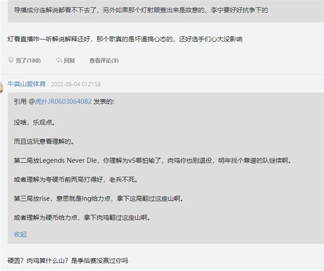 第二点,就是现场战歌的问题,导播分别播放了rise和Legends Never Die,被认为是偏向rookie、karsa等老选手,给他们放“战歌”。显然,这位导播的“成分”还明显。管泽元忍不住吐槽:他就在核心粉丝群里吧。