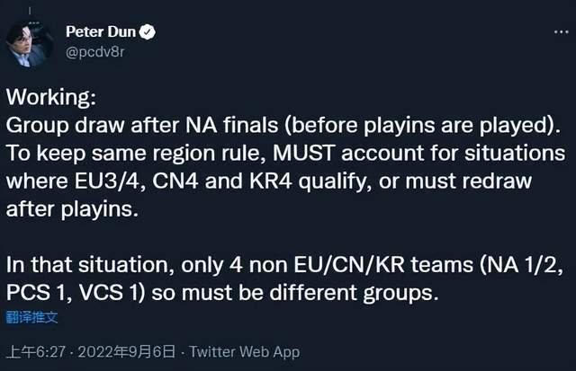 随着LPL赛区冒泡赛告一段落,四支代表LPL出征全球总决赛的队伍也已经全部决出。而海外赛区也大多都已经结束了夏季赛的全部赛程,目前已经有23支来自全球各大赛区的顶尖强队确认晋级S12全球总决赛,这也意味着今年S赛只剩下最后一个名额虚位以待。而EG作为拿到LCS赛区最后一张S12门票的队伍,他们的主教练在近日发文谈到了关于抽签规则可能出现的矛盾之处。