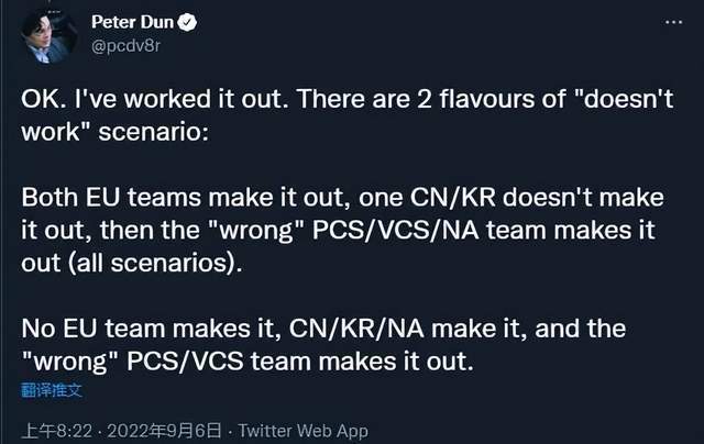 按照EG教练的模拟,有两种入围赛的晋级情况出现,会导致抽签分组必然会与同赛区规避的规则产生冲突。第一种可能出现的情况是LEC三号种子、MAD默认晋级,RNG/DRX两队有一支晋级,并且此时BYG/LCS三号种子/SGB中有一队出线。第二种情况是RNG、DRX以及北美三号种子晋级,加上BYG和SGB其中一支。如果入围赛两种情况出现,那么必然分组情况跟同赛区规避的规则有所冲突。