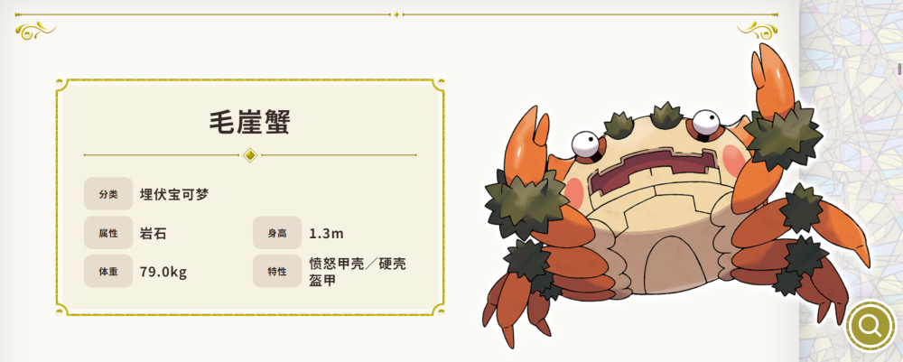 毛崖蟹,埋伏宝可梦,岩石属性,特性为愤怒甲壳/硬壳盔甲。