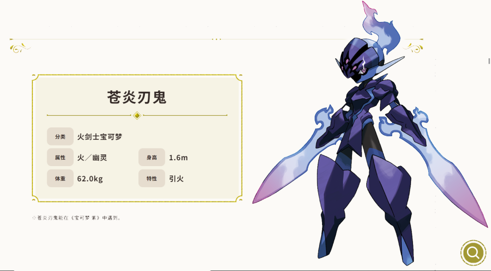 苍炎刃鬼,火剑士宝可梦,拥有火/幽灵的复合属性,特性引火,为《紫》版独占宝可梦。
