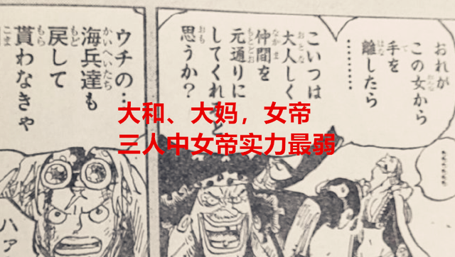 海贼王1059话漫画中,这里有一件事很值得大家注意的,大和留在和之国是因为防止海军大将带人来袭击和之国,之前大和打绿牛除了开头一棒子,之后被桃之助喝止住了行动,全程没开人兽,不能主动攻击只能被动防御,说明了大和基本有准大将的实力,而且大和是主动拒绝上船,目的是为保护桃之助,大和这操作,众人又改变了对她的看法。而另一边女帝的战力似乎有点不理想,准确点来说,女帝有点偏科,在大和、大妈当中算是最弱的一位女生了,下面一起来分析下吧。