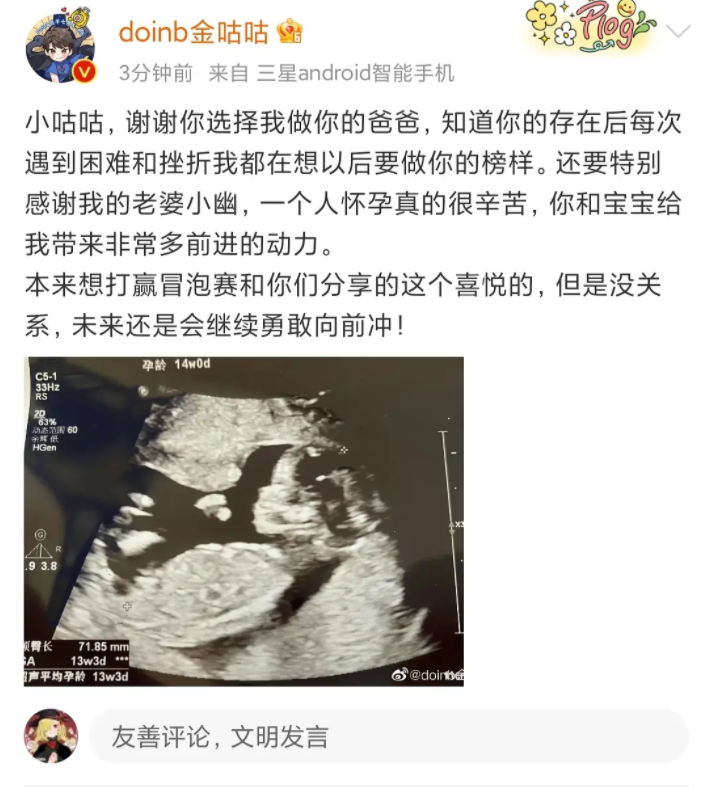 doinb的发文如下,他直接晒出了照片,并且表示自己有小咕咕了,原本是打算赢下冒泡赛,确认晋级世界赛后再和大家分享这个喜讯的,但是没关系,未来也会继续努力。另外doinb也表示有了孩子之后,自己会遇到困难和挫折都有了动力,想要成为孩子的榜样,也感谢糖小幽,怀孕很辛苦,她也给自己带来了很多动力。