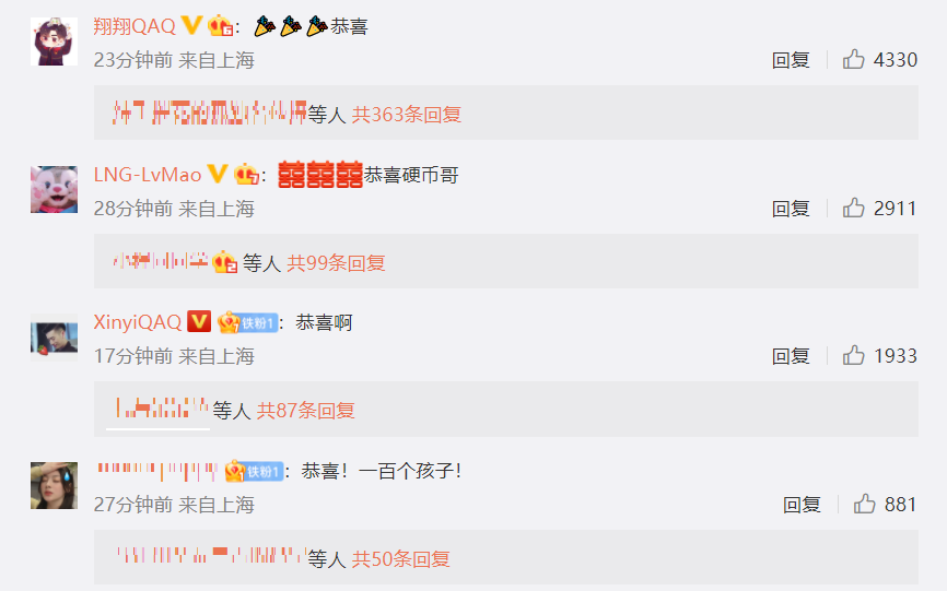 虽然事业上没能晋级世界赛,特别是倒在了最后一步,对于职业选手来说,是非常大的打击,但是doinb在家庭上还是有了新的收获。很多doinb的前队友也评论了doinb的微博,为他送上祝福,比如说Lwx、绿毛、xinyi等等,刘青松也转发了doinb的微博,但是没有评论。还有粉丝开玩笑玩梗表示恭喜doinb,一百个孩子。
