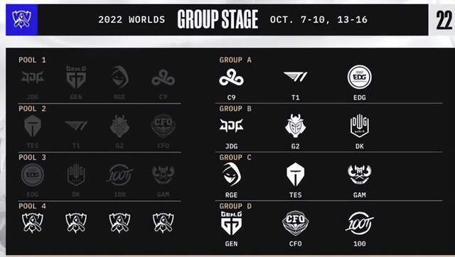 然后是B组,有JDG、DWG和G2,感觉JDG和DWG出线的希望很大,然后是C组,有RGE、GAM和TES,实力强劲的TES被分配到这一组,真的是天胡啊,出线的可能性几乎可以说是百分之百,D组是GEN、CFO、100T,这一组也算是天牌,GEN稳稳出线。