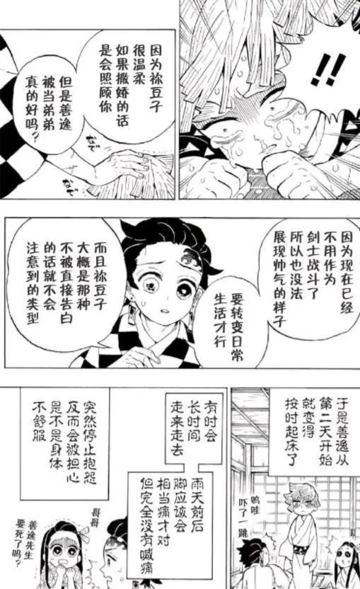 上文讲到,伊之助在祢豆子变成人类后特别粘着她,这可嫉妒坏一旁的善逸,为了争宠,善逸是不是就向祢豆子卖惨,说自己的脚痛,尽管收获祢豆子一波怜惜,但也被炭治郎告诫,如果善逸一直这样,祢豆子只会将她当做弟弟,两人想要进一步恐怕很难