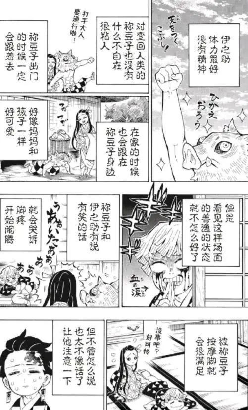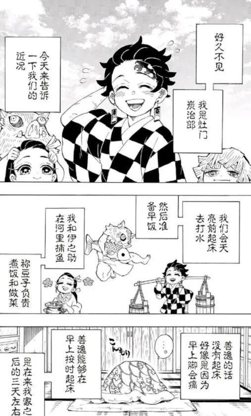 因为几人已经认识很久,因此生活起来也十分有默契,几人之间分工明确,炭治郎和伊之助负责一些粗重工作,祢豆子则负责洗衣做饭,善逸因为当时战斗时候伤到了脚,大部分时候只能打打下手,生活虽然简单,但也十分有趣