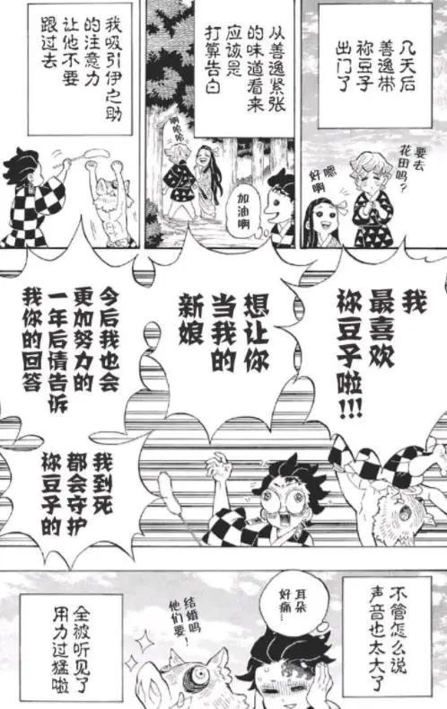 为了逆转祢豆子对自己的印象,善逸开始改变,为了尽快和祢豆子在一起,甚至主动告白,不过因为太紧张,善意在告白的时候没有控制好音量,不仅没有收获弥豆子的恢复,甚至让祢豆子收获暂时性耳聋