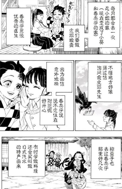 尽管战斗已经过去很久,炭治郎的身体看上去已经完全恢复,但他还是会定期去蝶屋进行身体检查,而现在的蝶屋成了香奈乎几人的家,香奈乎也代替蝴蝶忍成为蝶屋的医生,负责炭治郎等人的定期检查,连炭治郎都忍不住感叹香奈乎是很优秀的医生