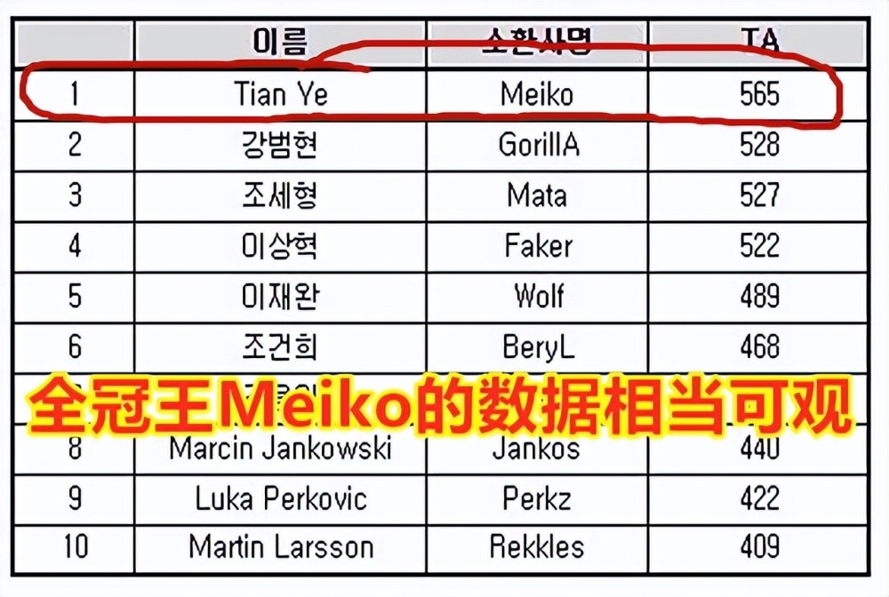 助攻榜TOP10。Meiko(全冠王)555次,GorillA528次,Mata527次,Faker522次,Wolf489次,BeryL468次,CoreJJ467次,Jankos440次,Perkz422次,以及Rekkles的409次。助攻榜,囧王者没啥好说的,只能说全冠王Meiko的数据令人惊叹;另外Faker果然还是那个Goat,作为一名中单,助攻次数竟然有追平Meiko的机会,细思极恐!