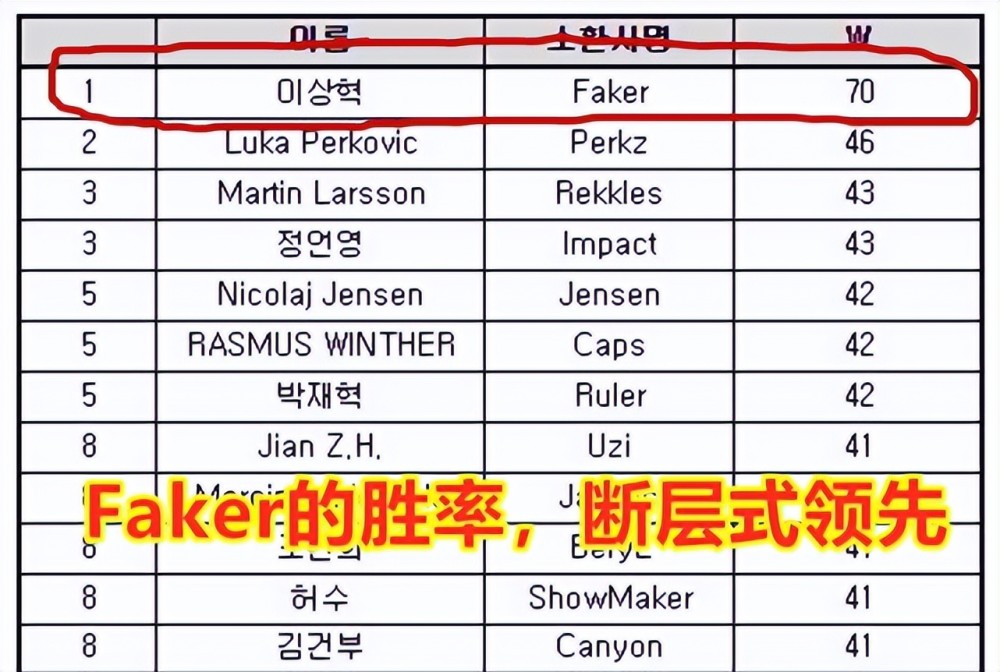 胜场次数TOP10。Faker70场,Perkz46场,Rekkles43场,Impact43场,Jensen42场,Caps42场,Ruler42场,Uzi41场,Jankos41场,BeryL41场,ShowMaker41场,Canyon41场。从胜场次数来看,依旧和出场次数类似,欧美选手和LCK选手占据了大头,LPL依旧只有UZI一人上榜。而且对于Faker而言,出场次数和胜率次数,他都是断崖式领先于其他选手。这个战绩,是与其三冠王的战绩分不开的。