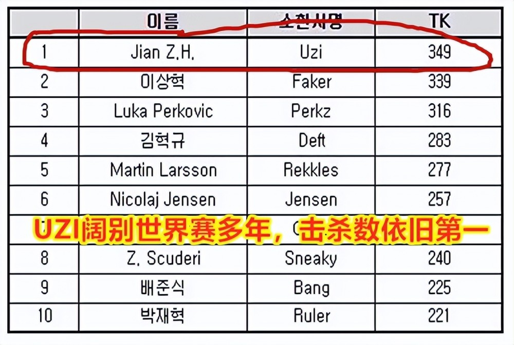 击杀数TOP10。Uzi349(LPL统计的是350次),Faker339次,Perkz316次,Deft283次,Rekkles277次,Jensen257次,Caps249次,Sneaky240次,Bang225次,以及Ruler的221次。与出场次数和胜场榜不同,击杀榜上,又是一番新天地。LPL的UZI,虽然已经离开世界赛数年了,但他却依旧稳坐击杀榜第一的宝座。尽管他的出场次数和胜场不多,但他的击杀数却高达349(350),远远领先于其他人。从数据来看,恐怕暂时只有Faker能超越UZI的数据。