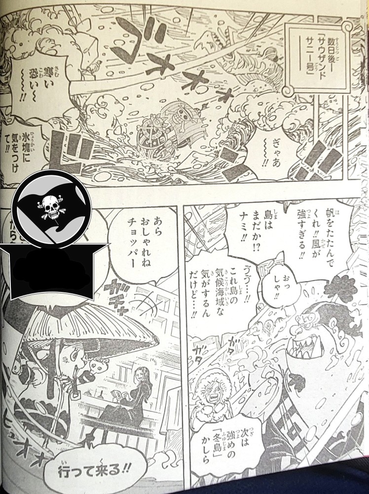转眼间已经过去数天,此时的草帽团的位置开始下雪同时海边上更是跟个疯子一样,掀起巨大海浪以及有海王类在活动,可以看出草帽团在这个地方的航行十分不易。