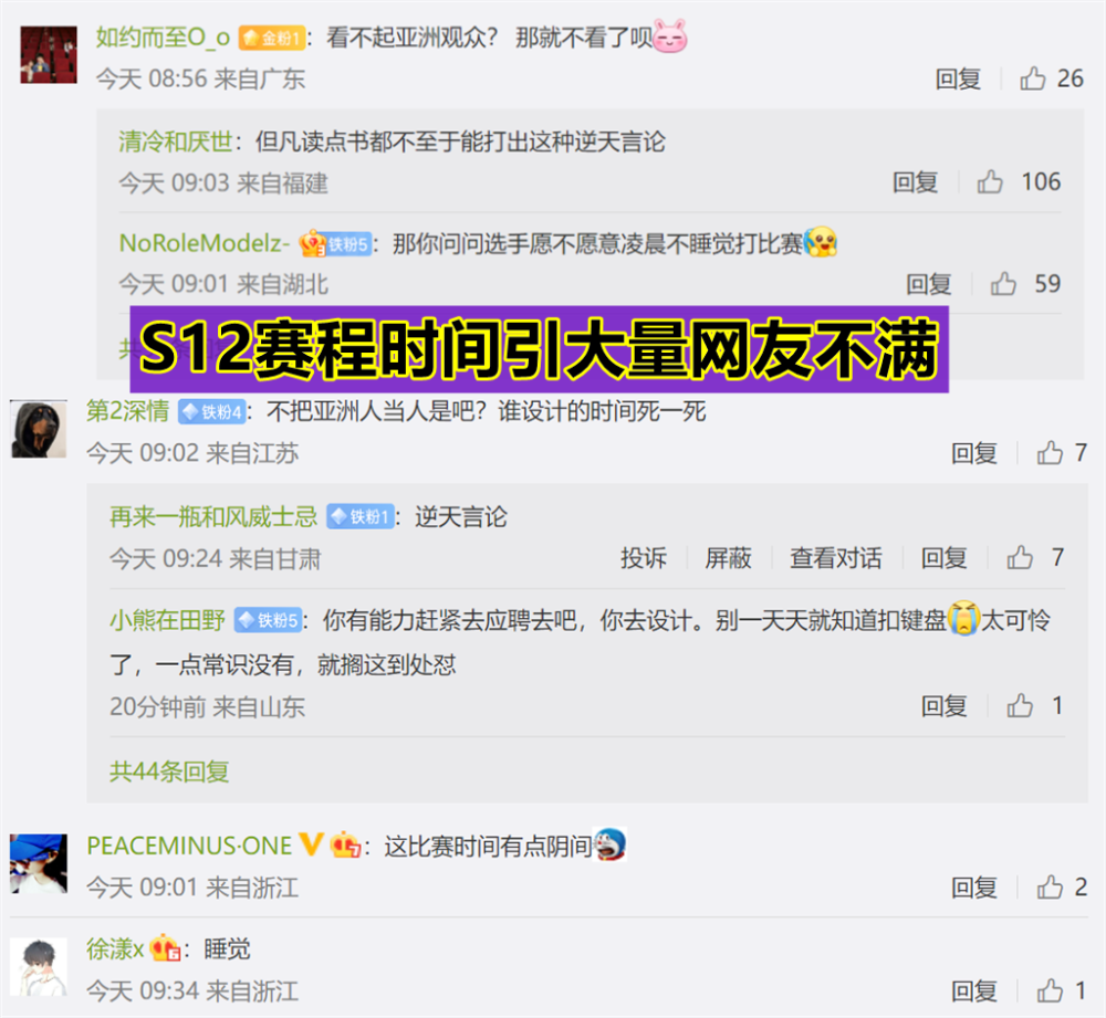 这个赛程时间安排一出,就引起了非常多网友们的不满,要知道S赛已经很长一段时间都是在北京时间的下午开打,如今S12的开赛时间直接来到了凌晨三四点,甚至五点的都有。