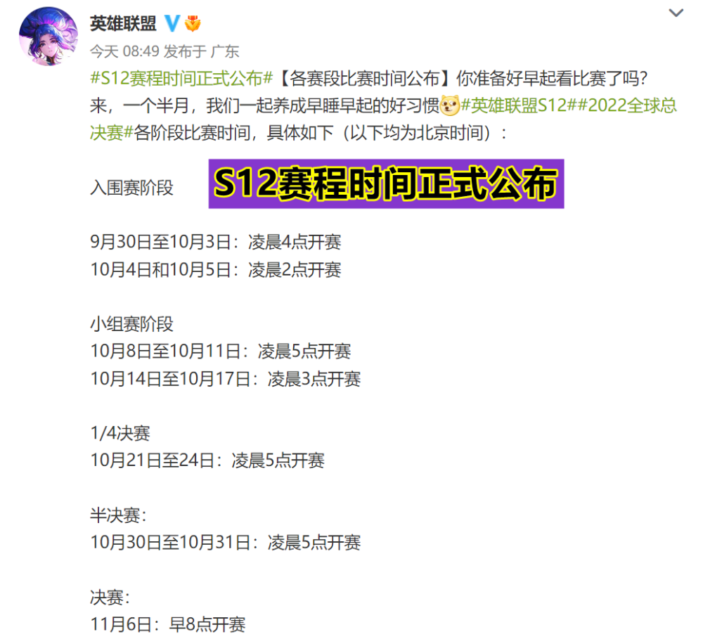 随着分组确定下来之后,拳头也是再次公布了S12的赛程时间,其中入围赛阶段,9.30号到10.3号的比赛将会在凌晨4点开赛,而10.4和10.5则是在凌晨2点开赛。