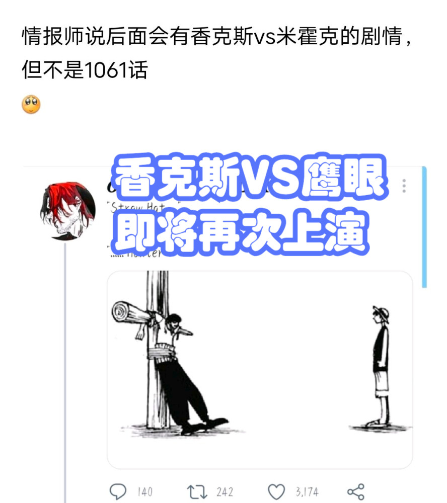 根据知情人(情报师)透露出来的信息,未来将上映《红发香克斯VS鹰眼米霍克》的决斗,但并不是1061话。