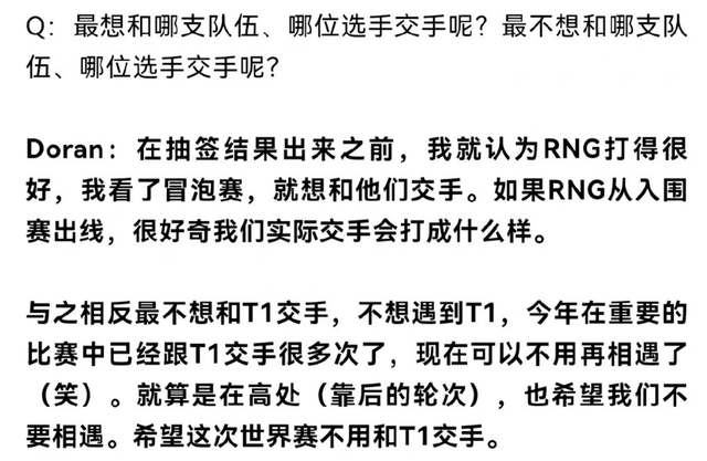 谈及最想、最不想交手的队伍时,Doran也是很真实地表示不希望和T1交手,原因是他们在今年已经和T1在重要比赛中多次相遇。而对他来说最希望遇到的是RNG,在抽签结果出来前看了LPL冒泡赛他就觉得RNG打得非常好,因此他很期待两支队伍实际交手会打成什么样。而LPL赛区粉丝看懂这段采访,也更加急切想要看到RNG能入围赛出线,在D组跟Gen.G来一场精彩的强强对话,相信会是本届S赛顶尖水准的较量。
