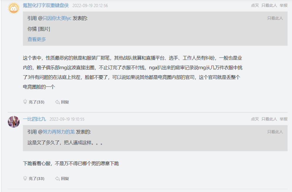 就以RNG拖欠服装厂的案子来看,RNG可谓是将无赖演绎的淋漓尽致。S9赛季价值480万的周边衣服,因为战队在全球总决赛的表现不佳而出现滞销的情况。RNG在货物积压的情况下,拖欠了整整一年。在S10赛季直言是因为质量问题才出现的滞销。结果在服装厂进行质量返工后,RNG依旧是不给钱。在二审的过程中,RNG从积压一年多的服装中挑出3件残次品去做质量检测,试图以这种方式拒绝还款。