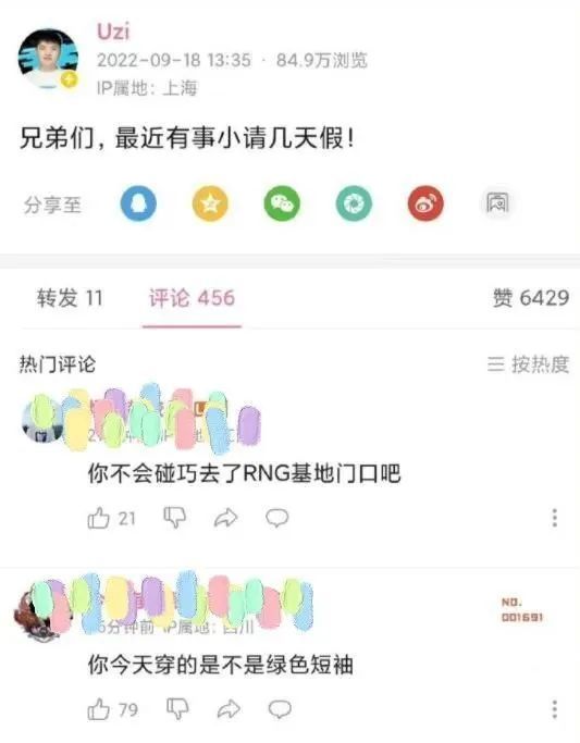 正是这些因素的存在,诸多水友认为是UZI在跪地讨薪,并为此展开了激烈的讨论。甚至不少水友跑到UZI微博下,询问此事:“你不会碰巧去RNG基地门口吧”、“你今天穿的是不是绿色短袖”,等等。
