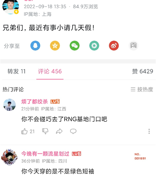 从图片上分析,这人肯定不是乌兹。但发型、身形太像了,难免有人误解。恰好,乌兹最近突然跟大家请假。之前奥咪咪产检、自己踢球都请过假,但一般只有一天。如今乌兹一下子请了几天假,LPL观众纷纷打趣:你不会碰巧去了RNG基地门口吧?你穿的是不是绿色短袖?