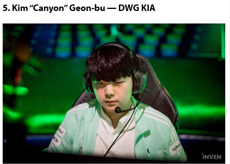 TOP5打野给到了DK的canyon,韩媒给出的理由是:虽然DK的上单没有夺冠时那么强了,但是canyon还是canyon,在世界赛上几乎没人可以阻止他。