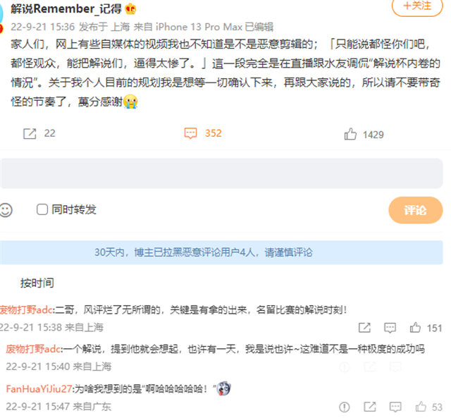 记得放话“退役”却惹来误会,大家以为他是对观众不满。实际上,记得是“口嗨”解说杯的强度,跟观众没什么关系。他不得不澄清事实:并没有责怪观众,只是“口嗨”解说杯而已,希望大家不要误会。