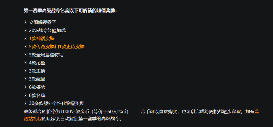 除了单买通行证以外,最划算的还有监测站礼包。监测站礼包的价格约等于三个通行证的价格,在内容上除了囊括了首个赛季的高级战令和两千金币以外,还有两个传奇级别的皮肤、绝版头像和典藏版,光是看这两个传奇皮肤的价值就已经推荐购买了。
