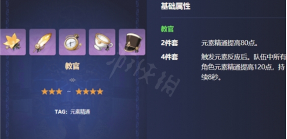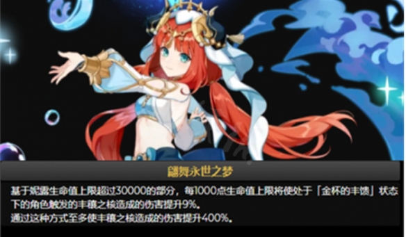 能给自身提高200点元素精通属性,给队友+120点元素精通属性,可以大幅提升妮露水草反应队的伤害。