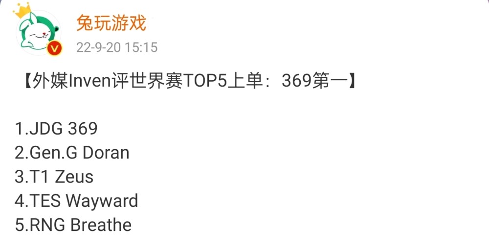 而在这段时间我们也是看到了外媒直接评选出世界赛五大上单选手,当然并不是什么权威的专业评选出来的,所以说仅供大家进行参考。可以说在目前世界赛外媒评选当中,有且只有上单一个位置,LPL赛区能够拿到第一名的成绩,那么也就是369选手,外媒的心目当中369是这次世界赛上单当中排在top1的,排在第二名的则是GEN战队的Doran,在第三名的是T1的Zeus,排在第四名的则是滔搏的Wayward,那么排在最后一名的则是RNG战队的呼吸哥。实际上这次外媒的评选还是比较有争议的,其实在这五名选手当中,除了369之外,不少网友心目当中都有自己的其他答案。