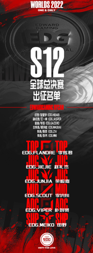 伴随着2022全球总决赛即将到来,作为本届世界赛的卫冕冠军,LPL的三号种子,EDG在近日公布了S12的出征名单。详情如下: