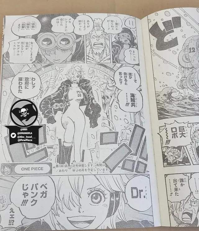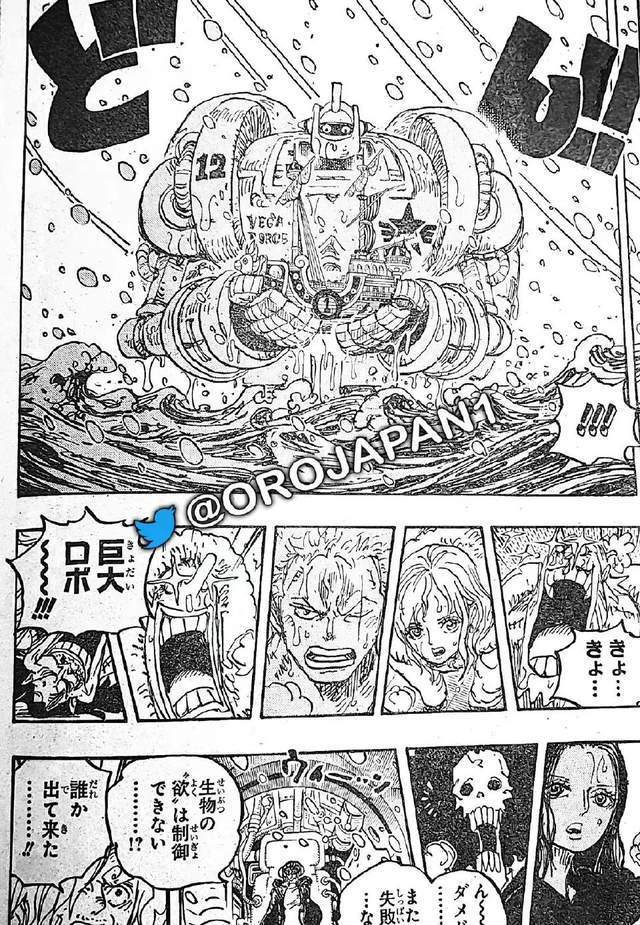 贝加庞克要登场了,草帽一伙被机器鲨鱼搞得很狼狈,好几个人掉入大海里,索隆跳入大海里与机器鲨鱼交战。贝加庞克乘坐一个巨大的机器堡垒出现在大海上,桑尼号都被机器人抓住,这个机器人非常居然,桑尼号都没有他的手掌大。贝加庞克从机器堡垒里出来,她的容貌终于曝光了。