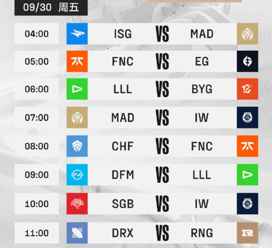 第二天RNG和MAD的比赛,安排在早上10点,而且这一天开始进入十一假期,LPL观众们会有非常充分的时间来看世界赛了。而对于LCK观众来说,DRX有2场比赛,时间分别是早上9点和中午11点,想看LCK的观众们时间也很好。