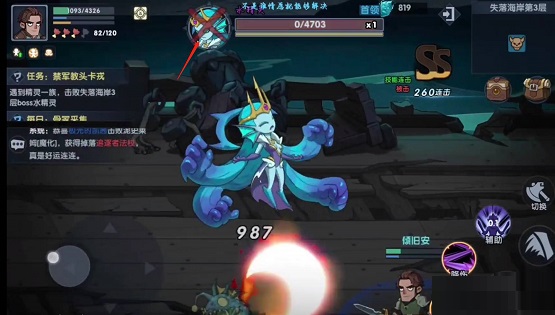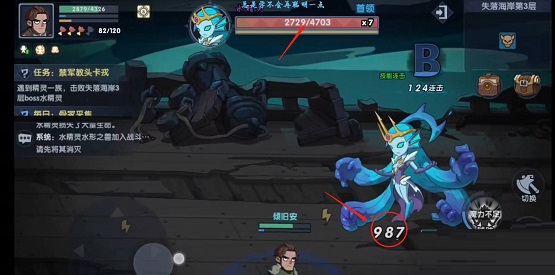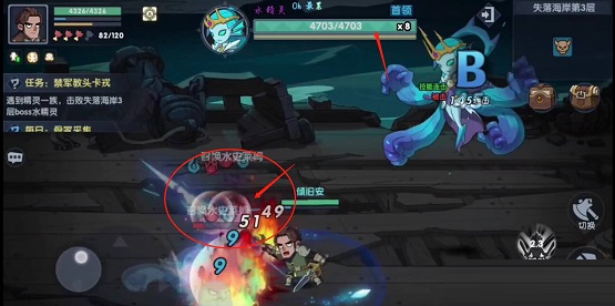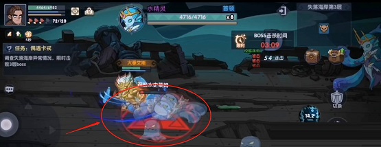 2、其中,小伙伴不能直接攻击水精灵,但是我们清理掉水精灵召唤的小怪后可以对其造成伤害。所以我们打水精灵不需要打boss,只需要打其召唤的小怪即可。
