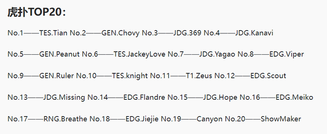 除此之外,这届S赛最受看好的队伍Gen.G选手也是排名相当靠前,Chovy排名第二,Peanut第五以及第九位的Ruler,足足有三人在TOP20榜上有名,可见LPL观众也是非常认可他们的实力。毫无疑问,Gen.G确实是这届S赛LPL队伍最大的竞争对手。
