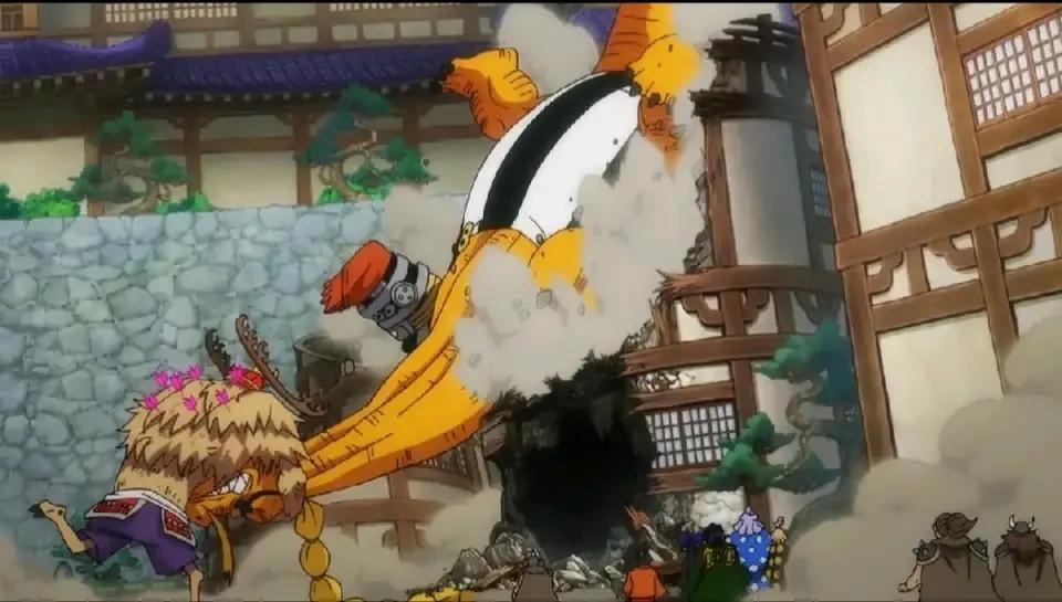 宴会厅的战斗很激烈,百兽海贼团与武士之间的战斗,乔巴与疫灾奎因的战斗还在持续当中。其实乔巴并不是疫灾奎因的对手,只是他吃了蓝波丸变成怪物,勉强与疫灾奎因交手。大妈长子也参战了,他在背后偷袭乔巴,放箭袭击乔巴,还好乔巴没有事。乔巴与疫灾奎因继续交战,双方的战斗挺有趣的,疫灾奎因好像被挨打,不断被乔巴打脸。