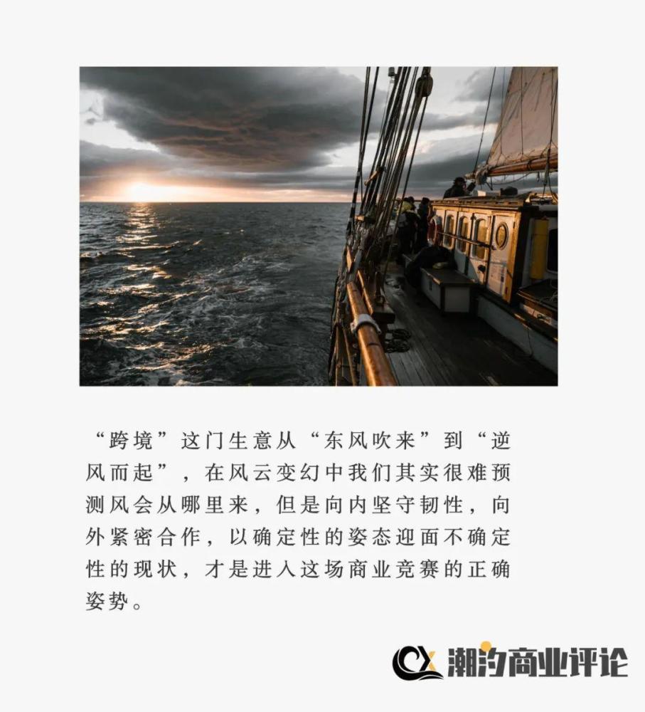 “跨境”这门生意从“东风吹来”到“逆风而起”,在风云变幻中我们其实很难预测风会从哪里来,但是向内坚守韧性,向外紧密合作,以确定性的姿态迎面不确定性的现状,才是进入这场商业竞赛的正确姿势。