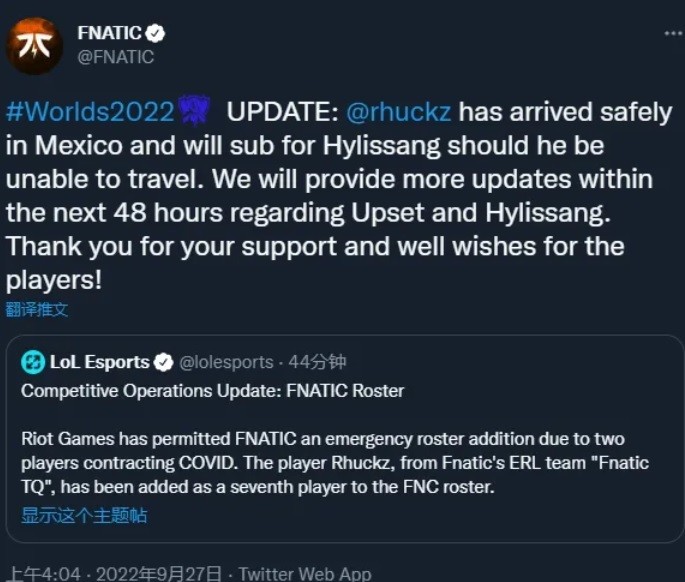今天早上FNC发布公告是临时征调了一个替补辅助,看起来Hylissang的情况不太好。