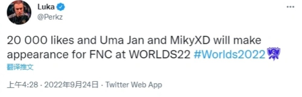 下路组合患病之后,G2的Perkz选手在社交平台上发了一条动态,表示说如果这一条点赞过两万,他就和Mikyx一起临时出战,代替FNC的下路组合。