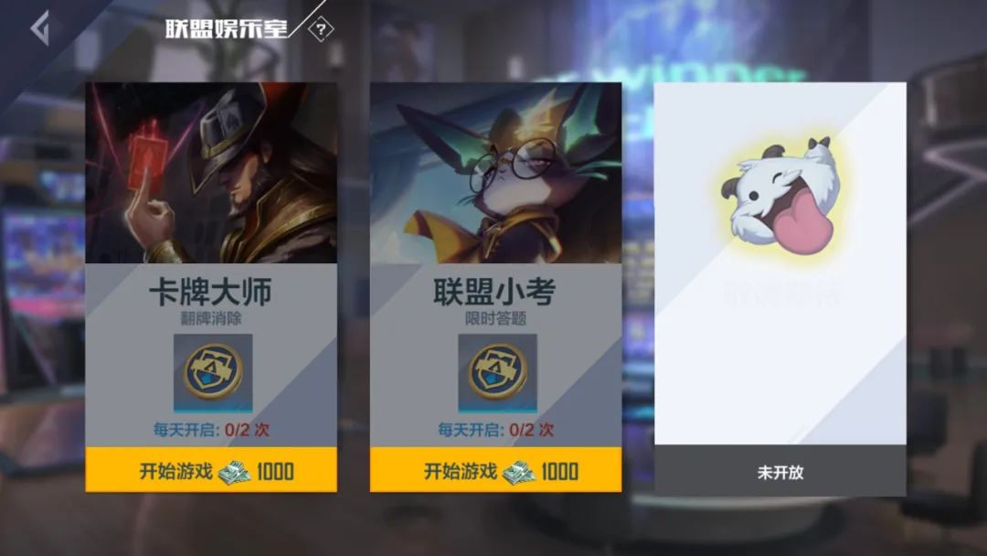 另外就是在联盟娱乐室玩翻牌手游和联盟的考试手游,翻盘手游的400是肯定可以拿满的,联盟的考试的话如果你非要想拿满的话是可以答到最后然后直接闪退再回来,一定是和上一次的题一样,但是这样比较累,就一天拿300就够了。