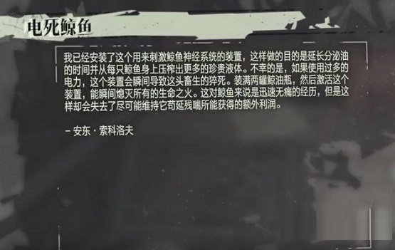 鲸鱼眼屠宰厂里有条大鲸鱼被吊着,拿两个鲸油罐去把鲸鱼正面楼梯下的电箱装上,然后拉鲸鱼面前的操作杆把鲸鱼电死,拿眼睛。放到找到任务字条的房间。