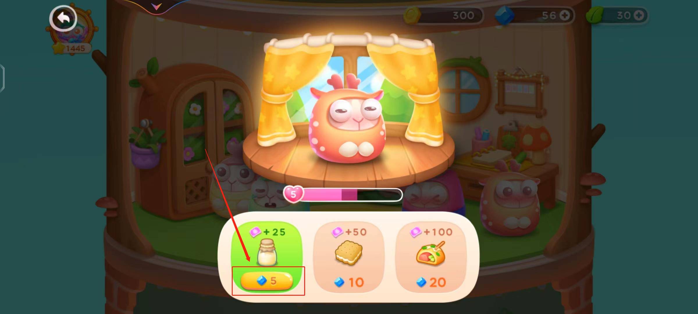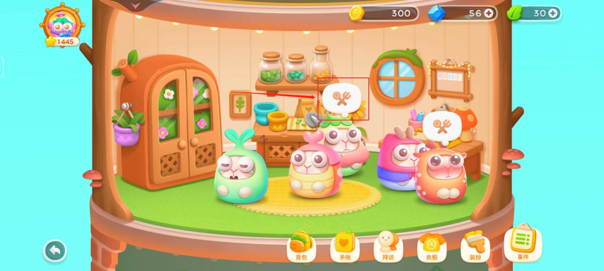 2、找到已经饥饿的兔兔,然后小伙伴点击兔兔头上的喂食图标。