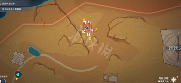 然后我们按照如图所示的顺序,根据方碑旁烈焰花蕊的数量0个到4个提示,依次点亮5个火元素方碑。