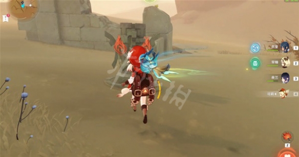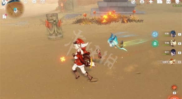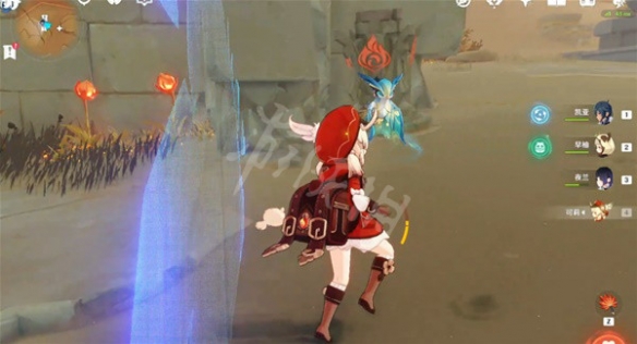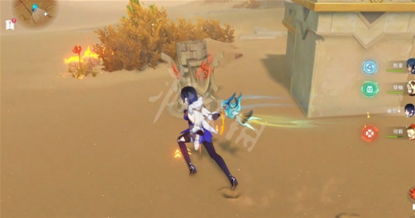 首先我们来到沙漠的西北角,正对着秘境的石碓,我们能看到在周围有几个火元素方碑,在方碑的周边还有烈焰花蕊。