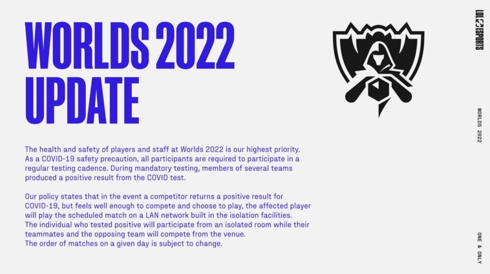 拳头在今天早上发布公告,在29日的常规检测中,多个选手呈阳性,解决方案是如果选手身体状况良好并且选择参加比赛,那么受影响的选手在隔离环境中使用线下网络进行比赛,患病选手会在单独的房间内参赛,队友和对方选手正常在场馆参赛。