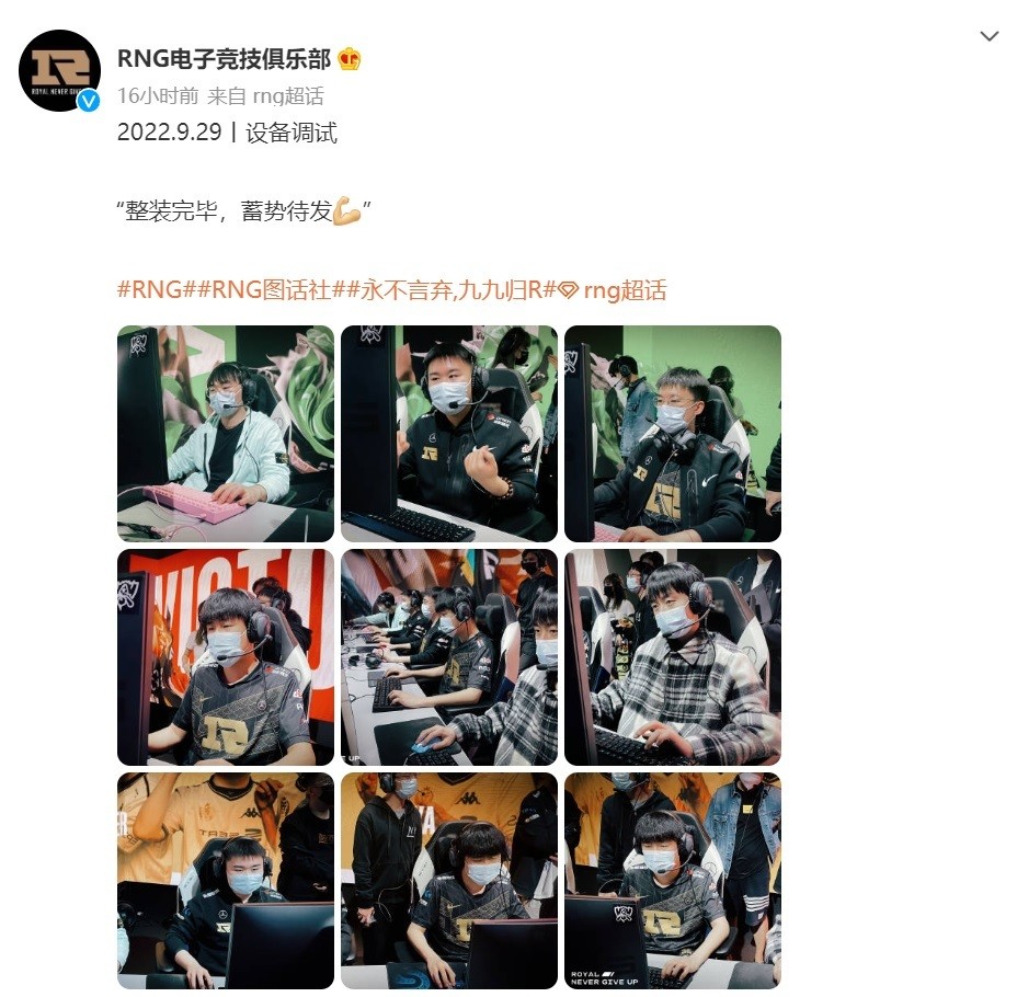 目前比赛依然在持续进行之中,RNG的比赛目前是暂定将会被拖延到12点半开始,RNG在早些时候是发布了一篇赛前的动态,几个选手都戴着口罩调试现场的设备,观众们注意到,相比于之前的设备布置格局来说,RNG几个选手之间的距离显得特别小。