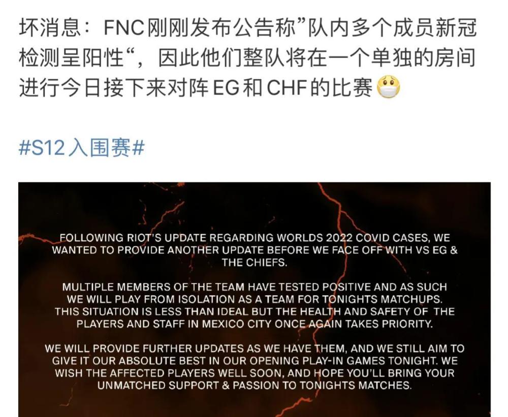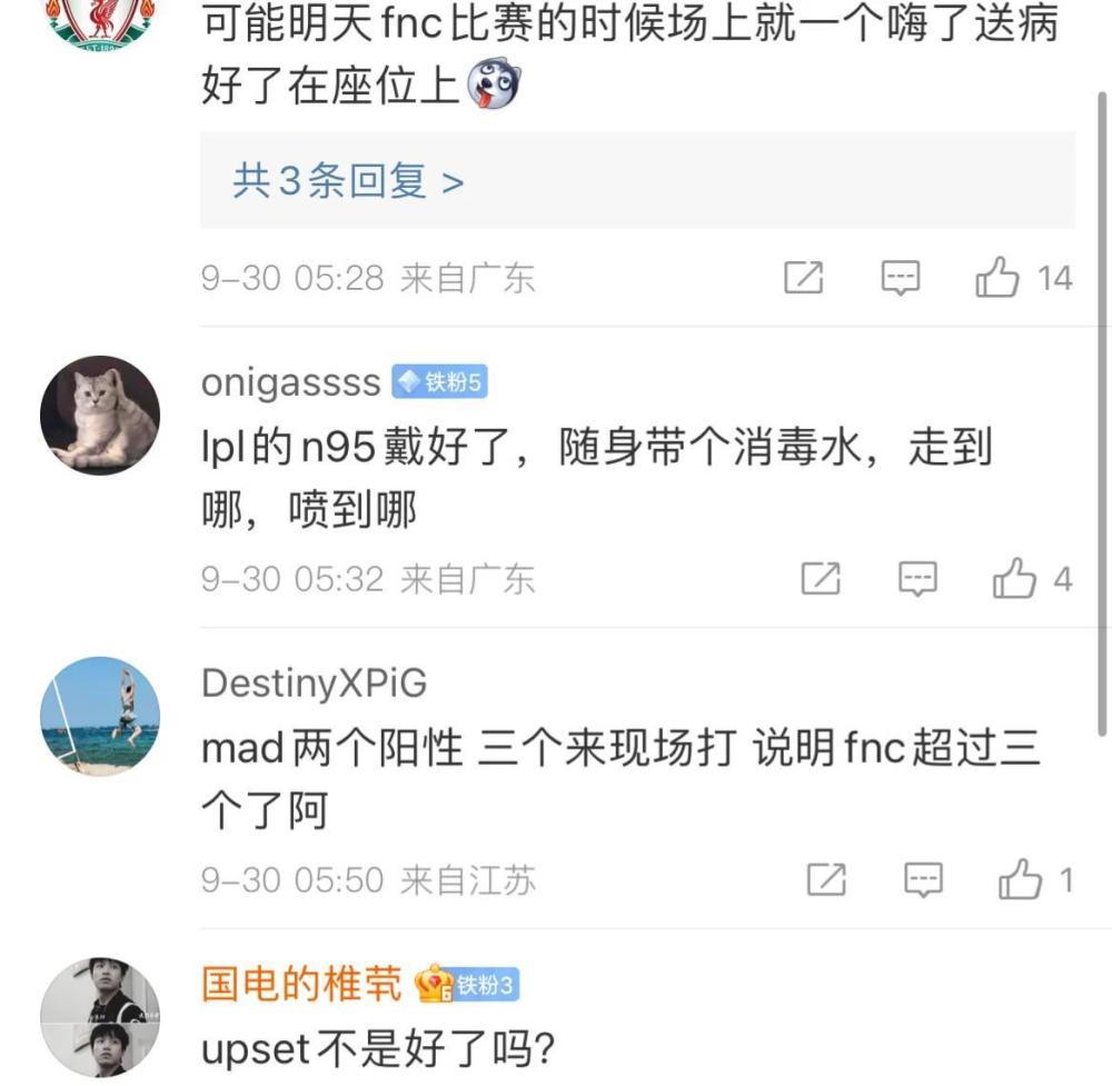 Fnc战队也是发布了通知,今日比赛多名选手出现问题,结果整支战队全部都在隔离房间进行比赛。看得出来,fnc战队目前的问题还是比较严重的,要不然的话也不可能所有队员全部都没能够出现在现场。每场的比赛结束之后,官方都会对设备进行擦拭和消毒,这点还是比较值得称赞的,但是官方是不是应该考虑一下线上对决呢?如果真的出现问题的话,那么参与比赛的战队几乎都是跑不掉的。