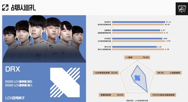 两队在数据上对比来看,RNG整体的数据会稍微差一些,毕竟这都是以近期比赛来看的!其中RNG这边一塔率就只有50%,而先锋和小龙以及大龙都只有25%左右,但是他们在15分钟领先的胜率是100%,当然这也足以说明他们的前期表现太差,因为前期都是被压着打,靠后期团战翻盘!而DRX这边一塔率在75%,小龙控制在48.2%,而他们的先锋控制率100%,在前期抓节奏当中,他们愿意去投资第一条先锋!而双C数据对比当中,Deft这边也是力压Xiaohu,尤其是在参战率当中!