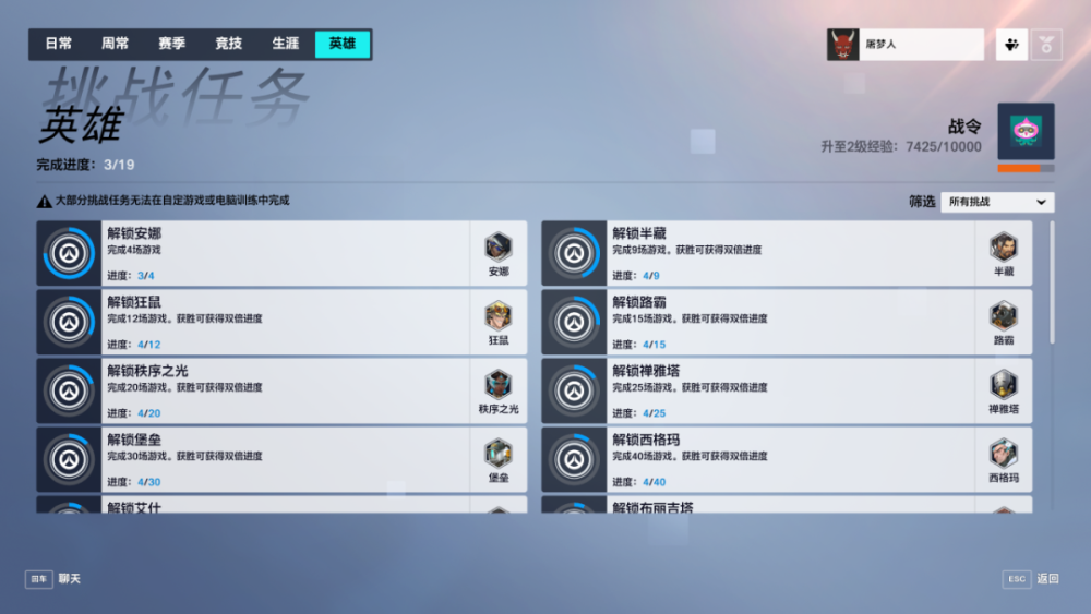 那么这些任务难完成吗?至少从目前我们看到的描述来说,没有难度过高的任务,无论是日常、周常、赛季和挑战等等,主要的难点还是它会更鼓励你尝试多样化的内容,比如非常典型的一个是,用除你最常用三名角色外的角色完成七场游戏。这估计也是增加对战多样性,减少匹配时间的一种手段。