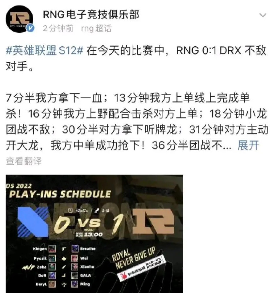 RNG输给DRX之后,负责撰写官博的工作人员出现巨大失误,战报写RNG输给了DRX,但是图片里面写成了RNG 1-0 DRX,而且比分也写反了,发现这个问题之后,官博快速反应,改了图片,但只改了比赛结果,忘记改人头比分了。