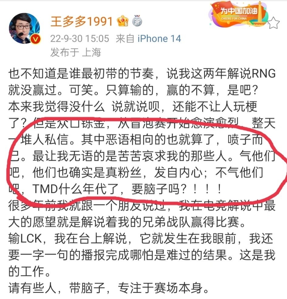 之前王多多在观众心目中的身份是RNG的粉丝(不确定是否真的是),他曾在多次解说RNG的比赛中,以恨铁不成钢的方式来说RNG,这一次被粉丝冲了,也是越想越气,在此之前,就有过战队输比赛,解说被冲的情况,只能说粉圈是真的不行。